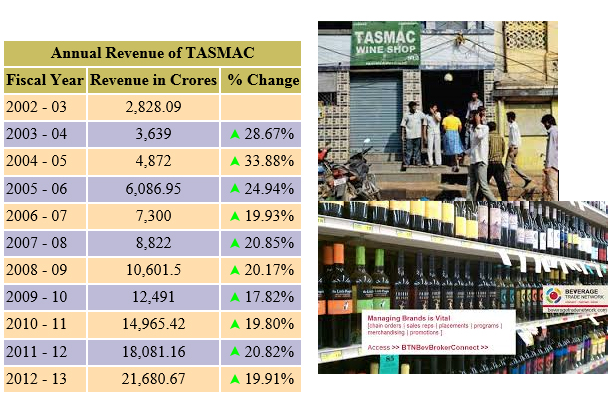 The state government, for years has been adding a huge amount of money to its exchequer by licensing and selling the liquor through its 2500 government controlled TASMAC shops. Liquor sales in 2011-12 has touched 18,081.16 crore rupees, registering a 20.82% increase. Every year during the New Year and Pongal festival, TASMAC is making around Rs. 500 crores selling liquor in wholesale and retail market.