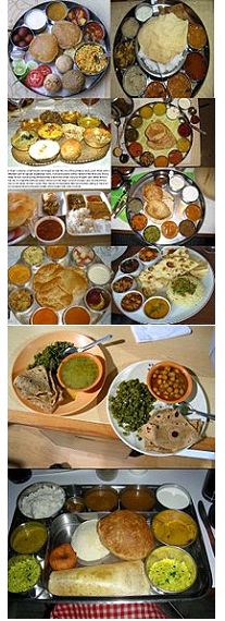Indian cuisine is diverse, ranging from very spicy to very mild, varying with seasons in each region. These reflect the local agriculture, regional climate, culinary innovations and cultural diversity. Food in India is sometimes served in thali - a plate with rice, bread and a selection of sides. Above are thali samples.