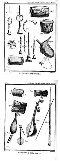 Images of musical instruments drawn by Pierre Sonnerat, the French explorer, in 1782 during his voyage through India.