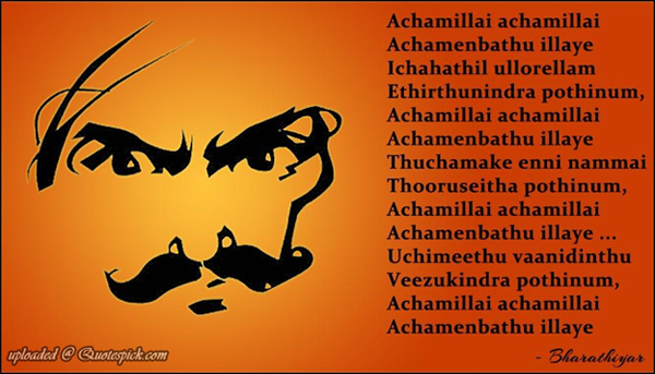 Bharathi worked as a school teacher and as a journal editor at various times in his life. As a Tamil poet he ranked with Ilanko, Thiruvalluvar and Kamban. His writings gave new life to the Tamil language - and to Tamil national consciousness. He involved himself actively in the Indian freedom struggle. It is sometimes said of Bharathi that he was first an Indian and then a Tamil. Perhaps, it would be more correct to say that he was a Tamil and because he was a Tamil he was also an Indian. For him it was not either or but both - it was not possible for him to be one without also being the other.