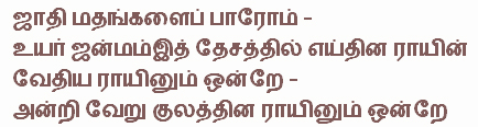 was Bharathi's salute to the Tamil nation and many a Tamil child has learnt and memorised those moving words from a very young age - and I count myself as one of them.Bharathi was a Hindu. But his spirituality was not limited. He sang to the Hindu deities, and at the same time he wrote songs of devotion to Jesus Christ and Allah. Bharathi was a vigorous campaigner against casteism. He wrote in 'Vande Matharam' :