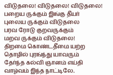 We shall not look at caste or religion, All human beings in this land - whether they be those who preach the vedas or who belong to other castes - are one Bharathi lived during an eventful period of Indian history. Gandhi, Tilak, Aurobindo and V.V.S.Aiyar were his contemporaries. He involved himself with passion in the Indian freedom struggle. His 'Viduthalai, Viduthalai' was not only a clarion call for freedom from alien rule but also addressed the need to unite a people across caste barriers -